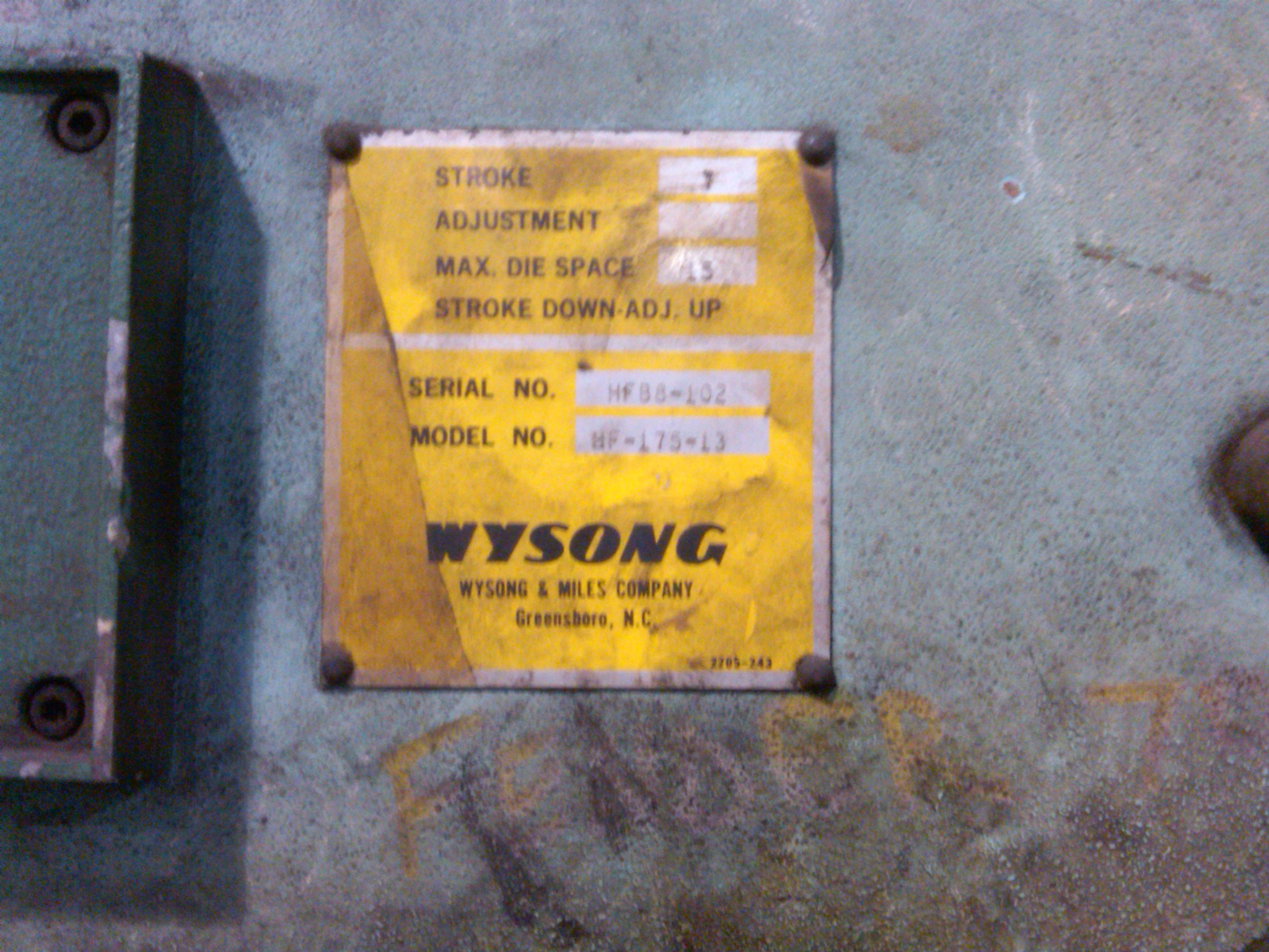 Pre Owned 1983 Wysong Model HF 175-13 Hydraulic Press BrakeSerial Number: HFB8-102GENERAL SPECIFICATIONSCapacity 175 TONSOverall Length of Bed & Ram 13’Distance Between Housings 10’ 1”Stroke 7”Open Height 15”Closed Height 8”Throat Clearance 12”Bed Height Above Floor 32”Bed Width 6”Main Motor Horsepower 20 EQUIPPED WITHVariable TonnageElectric Footswitch Palm Buttons on Ram Ram Tilt AdjustmentApproximate Overall Weight 27,000 lbs.Approximate Overall Dimensions 13 L X 5’5” W X 8’6" H